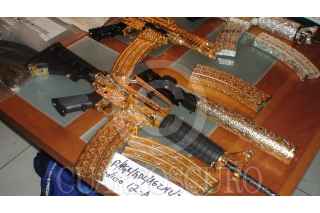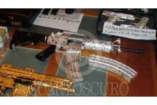 GUADALAJARA, JALISCO, 03MAYO2010.- Durante un operativo realizado en una finca de la colonia Jardines de Guadalupe del municipio de Zapopan, Jalisco; elementos de la Secretaría de la Defensa Nacional (Sedena) y de la Procuraduría General de la República (PGR), aseguraron un arsenal de armas largas chapeadas en oro y plata con otras incrustaciones de brillantes, rubíes y esmeraldas, que presuntamente pertenecían al narcotraficante Orlando Nava Valencia, conocido como "Lobo Valencia". FOTO: ESPECIAL/CUARTOSCURO.COM