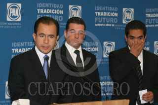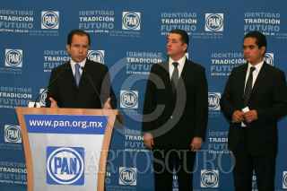 MÉXICO, D.F., 04MAYO2010.- Abel Hernandez, director general de comunicación del PAN, Guillermo Bustamante, representante legal del PAN y Cesar Nava, presidente del Acción Nacional, ofrecieron una conferencia de prensa donde dieron a conocer que impugnaran la decisión que tomó esta madrugada el Instituto Electoral de Aguascalientes, de no aceptar el registro del candidato del blanquiazul en Martín Orozco y anunciaron que el PAN pondrá una demanda en contra del gobernador de Oaxaca, Ulises Ruíz. FOTO: SAÚL LÓPEZ/CUARTOSCURO.COM
