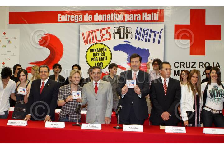 MÉXICO, D.F., 07MAYO2010.- Daniel Goñi Díaz, presidente de Cruz Roja Mexicana acompañado de varios artistas posan con el Disco de Oro otorgado al cd de "Voces por Haití" al termino de la entrega de la recaudación de dicho disco el cual fue invertido para la compra de ambulancias las cuales serán entregadas a la Cruz Roja de Haití; dicho acto se realizo en el auditorio de la sede de la Cruz Roja Mexicana. FOTO: RODOLFO ANGULO/CUARTOSCURO.COM