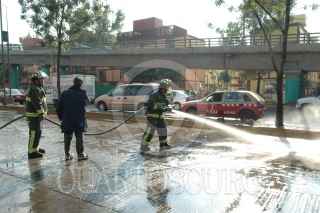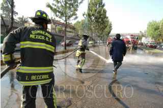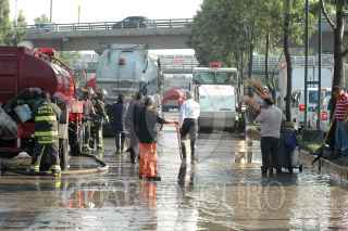 MÉXICO, D.F., 13MAYO2010.- Elementos del cuerpo de Bomberos, laboraron por varias horas en el Eje 3 Oriente a la altura de la delegación Venustiano Carranza, después que volcara un trailer que transportaba desechos de desasolve. FOTO: LUIS CARBAYO/CUARTOSCURO.COM