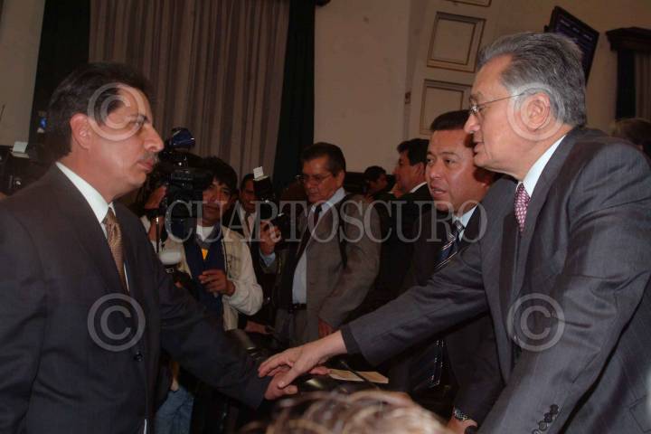 Mésico, D. F. 27DIC2003.- Los senadores miembros de la comisión de hacienda y cuenta pública Dulca María Sauri (PRI) Diego Fernández de Ceballos (PAN) y Juan de Dios Rodríguez Pratts platican dentro de la sesión del Senado de la República. FOTO: Iván Stephens/CAURTOSCURO.COM