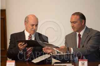 QUERETARO, QUERETARO, 14MAYO2010.- El responsable del Instituto Nacional de Estadística y Geografía (INEGI), Eduardo Sojo, firmó un convenio de colaboración inter-institucional con el gobernador del Estado José Calzada. FOTO: DEMIAN CHÁVEZ/CUARTOSCURO.COM