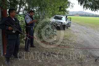 PEDRO ESCOBEDO, QUERETARO, 16MAYO2010.- Elementos de la policía Estatal de Querétaro, resguardan las entradas al rancho " La Cabaña " de donde desapareció Diego Fernandez, "Jefe Diego". Al interior laboran elementos de la Procuraduría del estado realizando investigaciones pertinentes. FOTO: LUIS CARBAYO/CUARTOSCURO.COM
