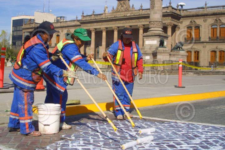 Monterrey N.L.10ENERO2004.- Señoras de la limpieza se encargan de encerar las calles a las afueras de el Palacio de Gobierno del estado de Nuevo León, lugar donde el presidente mexicano Vicente Fox, ofrecerá una cena de Gala para los diferentes presidentes y jefes de estado, que asistirán a la Cumbre de las Americas. FOTO: Garuda Daza/CUARTOSCURO.COM