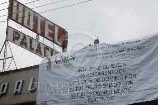 MÉXICO, D.F., 27MAYO2010.- Javier González del Villar, Coordinador General del Programa de Extinción de Dominio del Distrito Federal, dio a conocer el resolutivo sobre siete sentencias favorables al Gobierno del Distrito Federal en esta materia y coloca mantas alusivas a extinción de dominio en el hotel Palacio. FOTO: CUARTOSCURO.COM