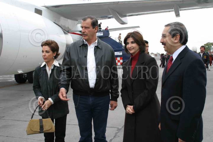MONTERREY.NuevoLeón.11.ENERO.2004.-El Presidente Vicente Fox y Marta Sahagún arribaron hoy a esta ciudad para la reunión de La Cumbre de las Américas a la que asisten mandatarios de America. Lo recibió el gobernador Natividad Gonzalez Parás y su esposa Cristina Maiz. FOTO: PEDRO VALTIERRA/CUARTOSCURO.COM