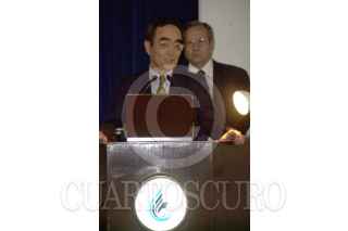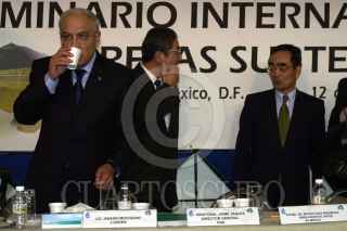 México D.F. 12 ENE 2004.- Hisashi Mochizuki, lider de la agencia J-Green, entrega el documento preliminar del estudio realizado por el representante de J-Green acerca de las presas subterréneas a Cristobal Jaime Jáquez, director general de la CNA, a su lado el embajador de Japón en México, Mutsuyoshi Nishimura. FOTO: Sandra Perdomo/CUARTOSCURO.COM