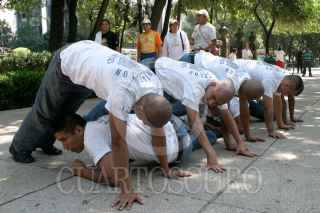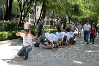 MÉXICO, D.F., 30MAYO2010.- Jóvenes integrantes del Pentathlon, Osos grises, practicaron rutinas de ejercicio sobre la acera de la avenida paseo de la Reforma. FOTO: ENRIQUE ORDOÑEZ/CUARTOSCURO.COM