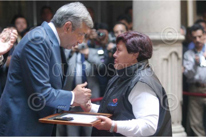 México, D. F.,12ENERO2004.- La señora Reyna Hernández López viuda del policía caído en el cumplimiento de su deber Juan Manuel Campos Hernández, observa el reconocimiento que recibió por parte del jefe de gobierno, durante ceremonia a policías destacados. FOTO: Moisés Pablo/CUARTOSCURO.COM