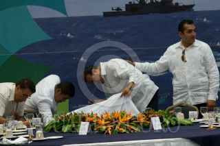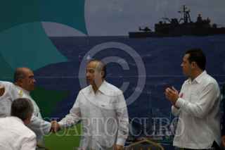 C.D. MADERO, TAMAULIPAS. 01JUNIO2010.- Felipe Calderón Hinojosa, presidente de México, acompañado de Francisco Saynez Mendoza, titular de la Secretaria de Marina, Guillermo Galván Galván, Secretario de la Defensa Nacional, Eugenio Hernández, gobernador de esta entidad, entre otros encabezo la ceremonia con la que se conmemoro el 68 Aniversario del Día de la Marina y el XCIII Aniversario de la Nacionalización de la Marina Mexicana. FOTO: GUILLERMO PEREA/CUARTOSCURO.COM