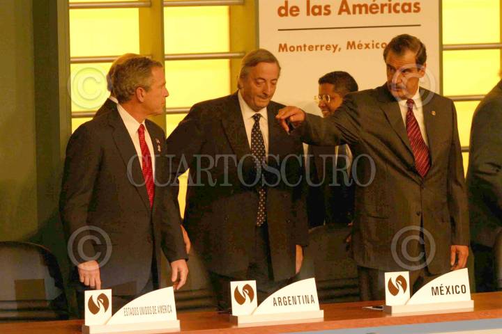 Monterrey, Nuevo León 12ENE2004 .- Momentos antes de iniciar la cena, en el Palacio de Gobierno, el presidente de Bolivia CarLos Mesa conversa con George Bush de Estados Unidos. FOTO PEDRO VALTIERRA/CUARTOSCURO.COM
