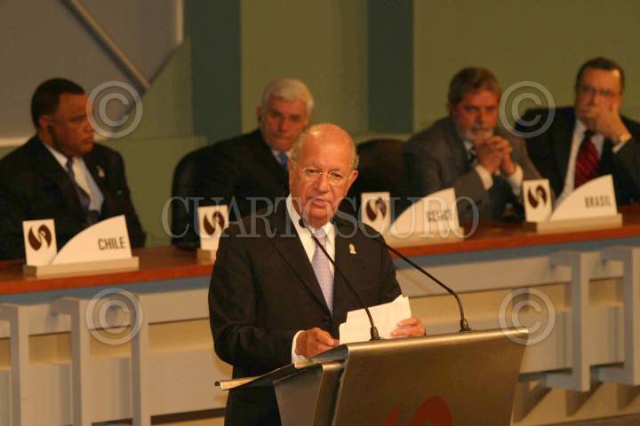 Monterrey, Nuevo León 12ENE2004 .- Momentos antes de iniciar la cena, en el Palacio de Gobierno, el presidente de Bolivia CarLos Mesa conversa con George Bush de Estados Unidos. FOTO PEDRO VALTIERRA/CUARTOSCURO.COM
