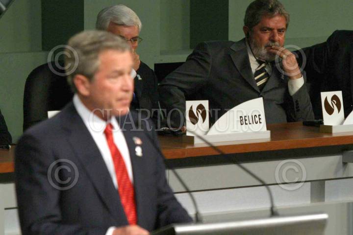 Monterrey, Nuevo León 12ENE2004 .- Momentos antes de iniciar la cena, en el Palacio de Gobierno, el presidente de Bolivia CarLos Mesa conversa con George Bush de Estados Unidos. FOTO PEDRO VALTIERRA/CUARTOSCURO.COM
