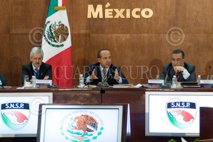 MÉXICO D.F. 03JUNIO2010.- Felipe Calderón Hinojosa, presidente de México, acompañado del gabinete de seguridad, y de los 31 gobernadores, encabezo la XVIII Sesión del Consejo de Seguridad que se realizó en las instalaciones del Casino del Campo Militar Marte. FOTO: GUILLERMO PEREA/CUARTOSCURO.COM