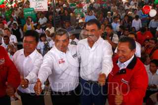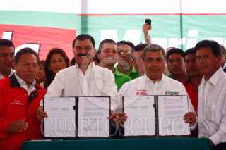 SAN PABLO DEL MONTE, TLAXCALA, 07JUNIO2010.- Hilario Salas, candidato a presidente municipal de San Pablo del Monte; Javier López Zavala, candidato a gobernador de Puebla; Mariano Gómez Zarur, candidatoa gobernador de Tlaxcala; y Mario Montero Serrano, candidato a presidente municipal de Puebla, abanderados por la alianza PRI-PVEM, realizaron la firma por el Desarrollo Metropolitano, en la que se comprometen a trabajar en conjunto para beneficiar a los estados vecinos. FOTO: FRANCISCO GUASCO/CUARTOSCURO.COM
