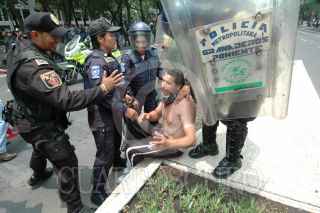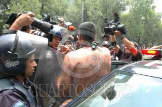 MÉXICO, D.F., 11JUNIO2010.- Un sujeto fue detenido por elementos del grupo de Granaderos de la Secretaria de Seguridad Publica por ocasionar disturbios en la zona del Ángel de la Independencia, durante los festejos de aficionados por el empate de la Selección Mexicana en el inicio del Mundial de Sudáfrica; el sujeto fue liberado después de despejar la zona. FOTO: LUIS CARBAYO/CUARTOSCURO.COM