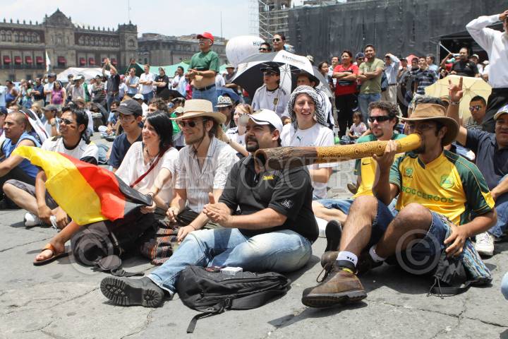 MÉXICO, D.F., 13JUNIO2010.- Un simpatizante del Sindicato Mexicano de Electricistas (SME) observa el partido entre Alemania y Australia del mundial Sudafrica 2010 en una de las pantallas gigantes instaladas en el Zócalo capitalino como parte del Fifa Fan Fest. FOTO: RODOLFO ANGULO/CUARTOSCURO.COM