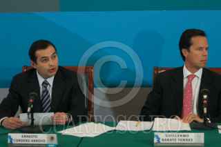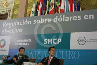 MÉXICO, D.F., 15JUNIO2010.- Ernesto Cordero Arroyo, Secretario de Hacienda y Guillermo Babatz Torres, presidente de la Comisión Nacional Bancaria y de Valores, ofrecieron una rueda de prensa en Palacio Nacional para hablar sobre la regulación sobre efectivo en dólares. FOTO: IVÁN MENDEZ/CUARTOSCURO.COM
