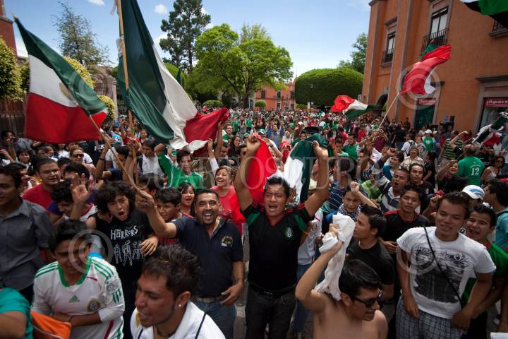 QUERÉTARO, QUERÉTARO, 17JUNIO2010.- Cientos de aficionados al fut bol se reunieron en diferentes plazas del centro histórico para festejar el triunfo de la selección Mexicana contra la selección Francesa con un marcador de 2-0, celebrado en el mundial de Sudafrica 2010. FOTO: DEMIAN CHÁVEZ/CUARTOSCURO.COM