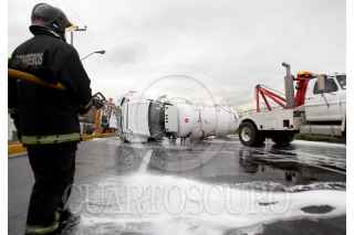 MÉXICO, D.F., 18JUNIO2010.- Una Pipa transportadora de Gas L. P. Con placas de circulación KU-15-409 de la empresa Energas, volcó al perder el control al circular sobre la avenida Rió de Los Remedios a la altura de la colonia Valle de Aragón por lo que elementos del cuerpo de Bomberos acudieron para evitar un accidente mayor. FOTO: LUIS CARBAYO/CUARTOSCURO.COM