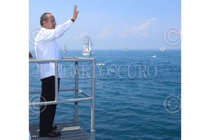 VERACRUZ, VERACRUZ, 23JUNIO2010. Fidel Herrera Beltrán, gobernador de la entidad, Felipe Calderón Hinjosa, Presidente de México y Guillermo Galván Galván, Secretario de la Defensa, dieron la bienvenida a el Buque Cuauhtemoc que participó en la regata Bicentenario. FOTO: ADOLFO JASSO/CUARTOSCURO.COM