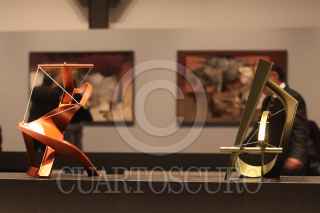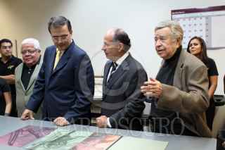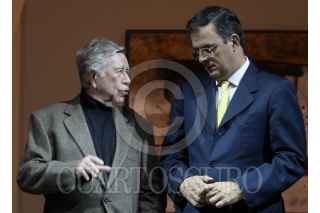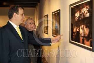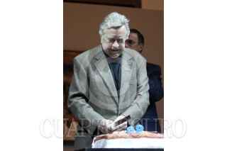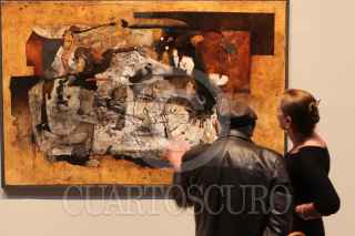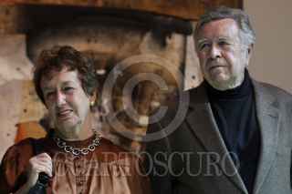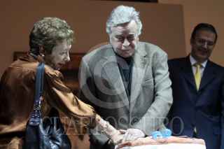 MÉXICO, D.F., 24JUNIO2010.- El artista plástico zacatecano Manuel Felguérez acompañado de su esposa Mercedes Oteyza cortan un pastel de cumpleaños durante la inauguración de la exposición "Manuel Felguérez, Ciudad en Movimiento" que se realizo en el Centro Cultural Estación Indianilla. FOTO: RODOLFO ANGULO/CUARTOSCURO.COM
