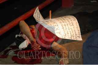 MORELIA, MICHOACAN, 24JUNIO2010.- Dos personas fueron ejecutadas en dos Avenidas de Morelia, además les pusieron "Narcomensajes" escritos en una cartulina len donde los exhibian de presuntos ladrones de autos y advertían que les iba a pasar a todos los ladrones de vehículos, las cartulinas estaban firmadas por el grupo "La Resistencia" que es un grupo armado del cártel de La Familia Michoacana.. FOTOS: LEOVIGILDO GONZÁLEZ/CUARTOSCURO.COM