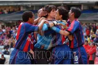 México, D.F. 01 FEBRERO 2004.- 3 goles a uno vencieron los potros de hierro del Atlante a "los rayos" del Necaxa en el encuentro de la jornada 3 del torneo de clausura 2004 en el estadio Azteca. En la gráfica el portero de Atlante Federico Vilar festeja con sus compañeros el triunfo. FOTO: Iván Stephens/CUARTOSCURO.COM
