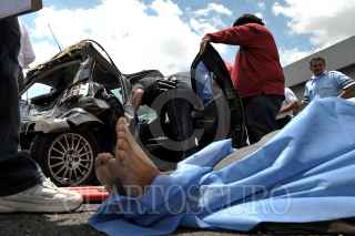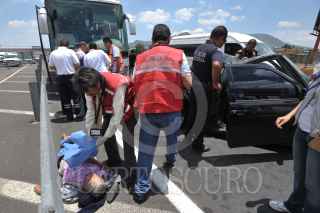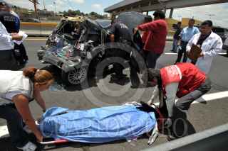 MÉXICO, D.F., 28JUNIO2010.- Una mujer de 75 años aproximadamente, pierdio la vida al ser impactado el auto Seat Ibiza de color negro con placas 573RFW en que viajaba por un autobús de la línea Futura con placas 869-HS-6 en el Kilómetro 1 de la autopista México Pachuca perímetro del Municipio de Ecatepec. Una persona fue trasladada grave al Hospital regional de la zona. FOTO: LUIS CARBAYO/CUARTOSCURO.COM