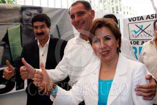 OAXACA, OAXACA, 28JUNIO2010.- Irma Piñeiro Arias, candidata a la gubernatura de Oaxaca por el Partido Nueva Alianza, convocó un 'voto útil' para la Alianza 'Unidos por la Paz y el Progreso' que abandera Gabino Cué Monteagudo; en compañía de este último la candidata dijo haber sido 'avasallados por el gobierno estatal', mediante la intromisión de intereses ajenos a su candidatura, por lo cual invitó a Votar el 4 de julio por Cué Monteagudo, declinando claramente a favor del candidato aliancista. FOTO: MAX NÚÑEZ/CUARTOSCRO.COM