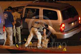 CIUDAD JUÁREZ, CHIHUAHUA, 01JULIO2010.- La Subprocuradora de Control de Asuntos Internos, Sandra Ivonne Salas y uno de sus escoltas fueron ejecutados sobre avenida De las Torres la noche de este miércoles. Otro de sus guardaespaldas resultó lesionado. La oficial de la Procuraduría General de Justicia en el Estado (PGJE), fue identificada oficialmente. La funcionaria con oficinas en Chihuahua realizaba tareas propias de su cargo en Ciudad Juárez y circulaba a bordo de una camioneta Durango, color blanco, por el crucero de las Torres y Jilotepec cuando fue acribillada junto con sus escoltas, al filo de las 21:15 horas. El herido fue hospitalizado en condición crítica, según los primeros informes. Varias armas largas, R-15 fueron encontradas dentro de la unidad, mismas que al parecer no alcanzaron a accionar los escoltas. FOTO: IGNACIO RUIZ/CUARTOSCURO.COM