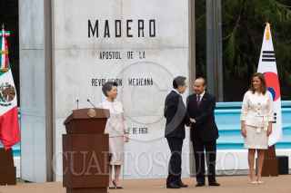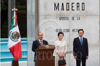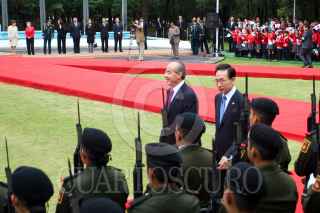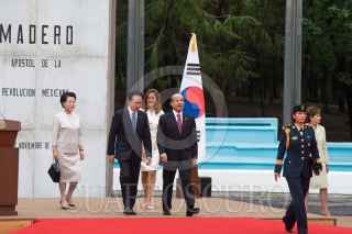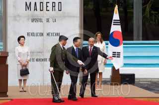 MÉXICO D.F., 01JUNLIO2010.- Felipe Calderón Hinojosa, Presidente de México, acompañado de su esposa Margarita Zavala, encabezo la ceremonia de bienvenida oficial a Lee Myung-Bak, Presidente de Corea del Sur, quien asistió acompañado de su esposa Kim Yoon-ok, esto en la explanada Francisco I. Madero de la residencia oficial de los Pinos. FOTO: GUILLERMO PEREA/CUARTOSCURO.COM