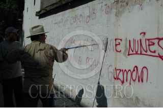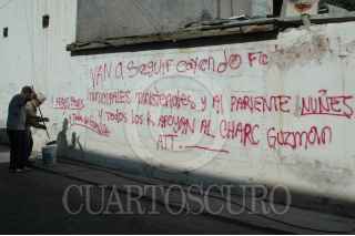 CIUDAD JUÁREZ, CHIHUAHUA, 01JULIO2010.- En una pared blanca de las calles Honduras y Vicente Guerrero un grupo delictivo dejó un mensaje en contra de todas aquellas autoridades que supuestamente están apoyando a "El Chapo". Fue esta mañana cuando se localizó la narcopinta que textualmente cita: "Van a seguir cayendo federales, municipales, ministeriales y al Pariente Núñez y todos los que apoyan al Chapo Guzmán y Reyes Ferriz y toda su familia". FOTO: IGNACIO RUIZ/CUARTOSCURO.COM