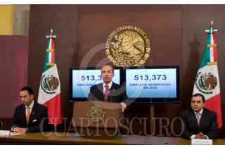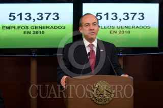 MÉXICO D.F. 01JUIO2010.- Felipe Calderón Hinojosa, Presidente de México, acompañado de Ernesto Cordero Arroyo, Secretario de Hacienda y Crédito Público, Javier Lozano Alarcón, titular de la Secretaria del Trabajo, Gerardo Ruiz Mateos, Secretario de Economía y Daniel Karam Touhmet, Directos del IMSS, dio a conocer la creación de 513373 empleos formales los cuales fueron generados durante el primer semestre de este año, esto en la residencia oficial de los Pinos. FOTO: GUILLERMO PEREA/CUARTOSCURO.COM