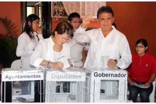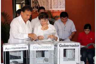 BOCA DEL RÍO, VERACRUZ, 04JULIO2010.- Miguel Ángel Yunes Linares, candidato de la coalición PAN-PANAL “Viva Veracruz” a la gubernatura del estado, en compañia de su esposa, Eva Ramirez de Greer, quienes acudieron esta mañana a emitir su voto. FOTO: JOSÉ CANDELARIO/CUARTOSCURO.COM