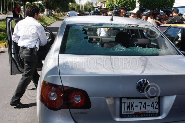 PUEBLA, PUEBLA 04JULIO2010.- Un automóvil Volkswagen Bora placas TNK-72-42, que portaba propaganda del candidato a gobernador por la coalición "Compromiso por Puebla" Rafael Moreno Valle, fue estrellado del cristal trasero por presuntos provocadores enviados por el PRI. FOTO: FRANCISCO GUASCO/CUARTOSCURO.COM