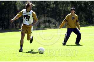 México D.F. 03 FEBRERO 2004.- El director técnico de los Pumas, Hugo Sánchez (al centro), se ejercita mientras su eqiupo entrena para el Torneo de Clausura 2004. FOTO: Sandra Perdomo/CUARTOSCURO.COM