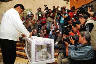 DURANGO, DURANGO, 04JULIO2010.- Jorge Herrera Caldera, candidato al gobierno del estado por el PRI acudió acompañado de su familia a emitir su voto en la casilla correspondiente durante la jornada electoral. FOTO: MANUEL DAVILA/CUARTOSCURO.COM