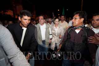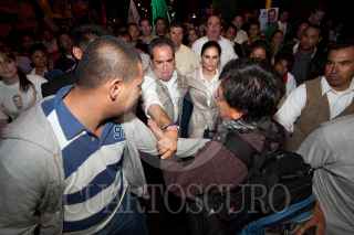 AGUASCALIENTES, AGUASCALIENTES, 04JULIO2010.- El fotógrafo de la agencia Notimex, Javier Lira es empujado y pateado por escoltas del candidato Carlos Lozano, candidato priista a la gubernatura, que intervino tras el forcejeo, esto cuando el ex-senador priista, se dirigía a la Plaza Principal para realizar su festejo tras su virtual triunfo en la contienda electoral FOTO: DEMIAN CHÁVEZ/CUARTOSCURO.COM