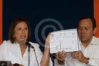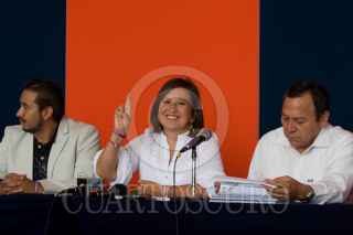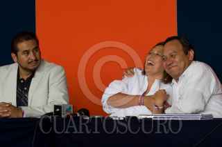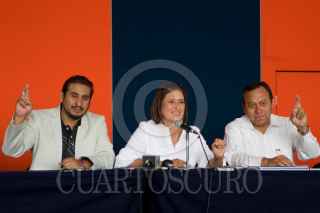 PACHUCA, HIDALGO 05JULIO2010.- Xóchilt Gálvez, candidata a la gobernatura por la coalición “Hidalgo Nos Une” acompañada de Arturo Aparicio, dirigente estatal del PT y de Jesús Zambrano, Diputado del PRD, dio a conocer que impugnara los resultados de la elección. FOTO: GUILLERMO PEREA/CUARTOSCURO.COM