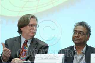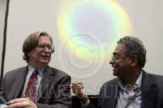 MÉXICO, D.F., 06JULIO2010.- George Smoot, Premio Nobel de Física 2006 y Abhay Ashtekar, presidente del comité internacional GR19, ofrecieron una conferencia de prensa en el marco de las actividades de la 19th International Conference on General Relativity and Gravitation, esto en el Centro Banamex. FOTO: MOISÉS PABLO/CUARTOSCURO.COM