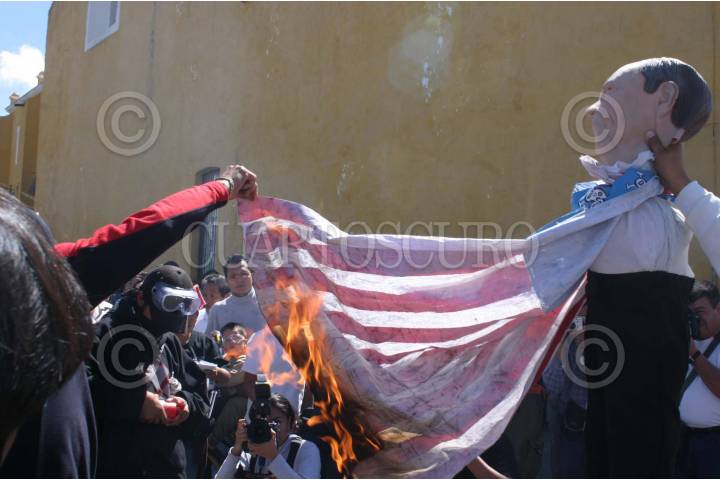 Puebla, Puebla 05 FEBRERO 2004.- Miembros del sindicato mexicano de electricistas, lanzan protestas encontra de los acuerdos de libre comercio que el gobierno norteamericano pretende firmar con América Latina. Durante la marcha que salió del zócalo de Puebla al centro de convenciones donde se realiza la reunión de viceministros del ALCA. FOTO: Moisés Pablo/CUARTOSCURO.COM