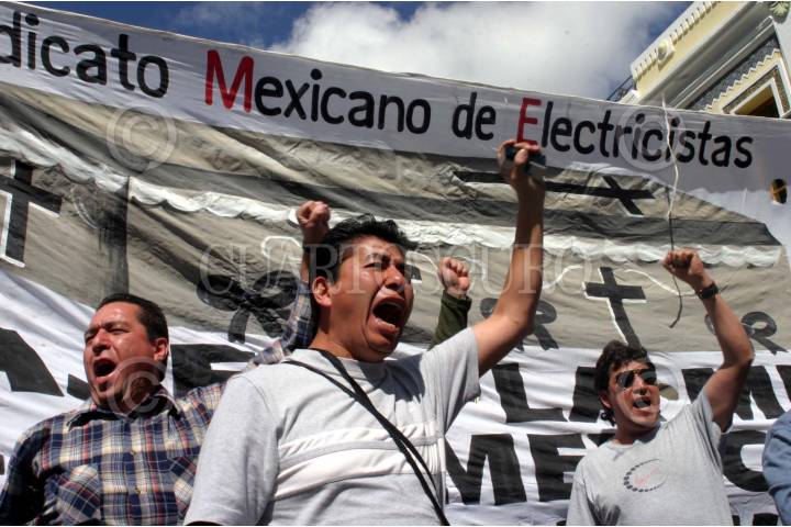 Puebla, Puebla 05 FEBRERO 2004.- Miembros del sindicato mexicano de electricistas, lanzan protestas encontra de los acuerdos de libre comercio que el gobierno norteamericano pretende firmar con América Latina. Durante la marcha que salió del zócalo de Puebla al centro de convenciones donde se realiza la reunión de viceministros del ALCA. FOTO: Moisés Pablo/CUARTOSCURO.COM