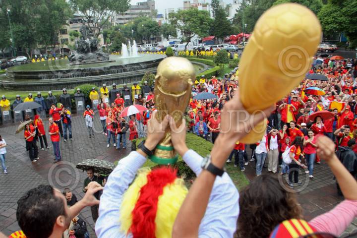 MÉXICO, D.F., 07JULIO2010.- Españoles residentes en México, festejaron el triunfo de su Selección en la Glorieta de Cibeles, al vencer a la selección alemana 1 a 0, pasando así a la final del torneo mundialista. FOTO: LUIS CARBAYO/CUARTOSCURO.COM