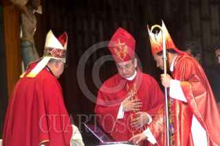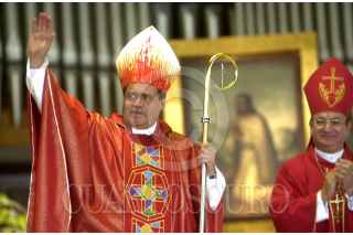 México D.F, 05FEB2004.- El cardenal Norberto Rivera de despide de los fieles al término de la Misa con motivo de la eucaristía del Día del Jovén Creyente que se llevo a cabo en la Basilica de Guadalupe. FOTO: Eunice Adorno/CUARTOSCURO.COM