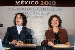 MÉXICO, D.F., 08JULIO2010.- Consuelo Saizar presidenta del Conaculta junto a Jacqueline Peschard comisionada presidenta del IFAI durante la firma de colaboración para fortalecer la información y la rendición de cuentas. FOTO: CUARTOSCURO.COM