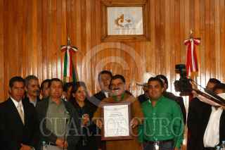 SAN MIGUEL CONTLA, TLAXCALA, 27JUNIO2010.- Mariano González Zarur, candidato a gobernador por la alianza PRI-PVE en el estado de Tlaxcala, fue felicitado por Mario Marín García, hijo del mandatario de Puebla, tras recibir su constancia de mayoría de votos por el Instituto Electoral de Tlaxcala (IET), que lo acredita como ganador de la contienda electoral del pasado 4 de julio. FOTO: FRANCISCO GUASCO/CUARTOSCURO.COM