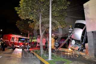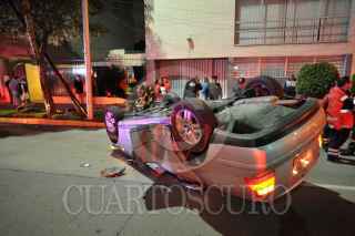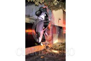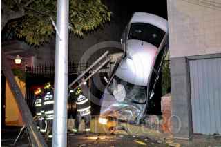 MÉXICO, D.F., 11JULIO2010.- Un auto Volks Waguen tipo Jetta de color gris con placas de circulación 866- UWN del Distrito Federal, quedo colgado del barandal de una casa que sirve de protección, al circular en exceso de velocidad sobre la avenida Patriotismo a la altura de calle 13 en la colonia San Pedro de Los Pinos. El conductor responsable de este accidente se dio a la fuga dejando el auto abandonado. FOTO: LUIS CARBAYO/CUARTOSCURO.COM