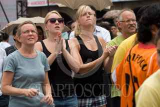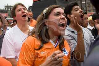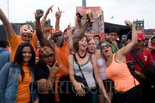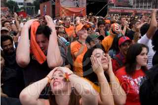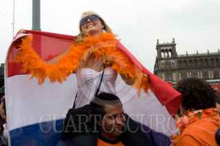 MÉXICO D.F., 11JULIO2010.- Aficionados de la selección Holandesa, acudieron a la plancha del Zócalo para ver la final del mundial entre la selección de Holanda y España. Con anotación en el segundo tiempo extra de Andrés Iniestra, la selección Española se corono Campeona Mundial de Futbol por primera vez en su historia. FOTO: GUILLERMO PEREA/CUARTOSCURO.COM