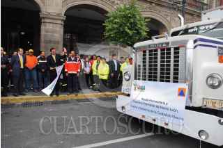 MÉXICO, D.F., 12JULIO2010.- Marcelo Ebrard Casaubon, Jefe de Gobierno Capitalino, dio el banderazo de salida a los camiones con ayuda humanitaria hacia los estado que fueron afectados por el paso del huracán Alex. FOTO: CUARTOSCURO.COM